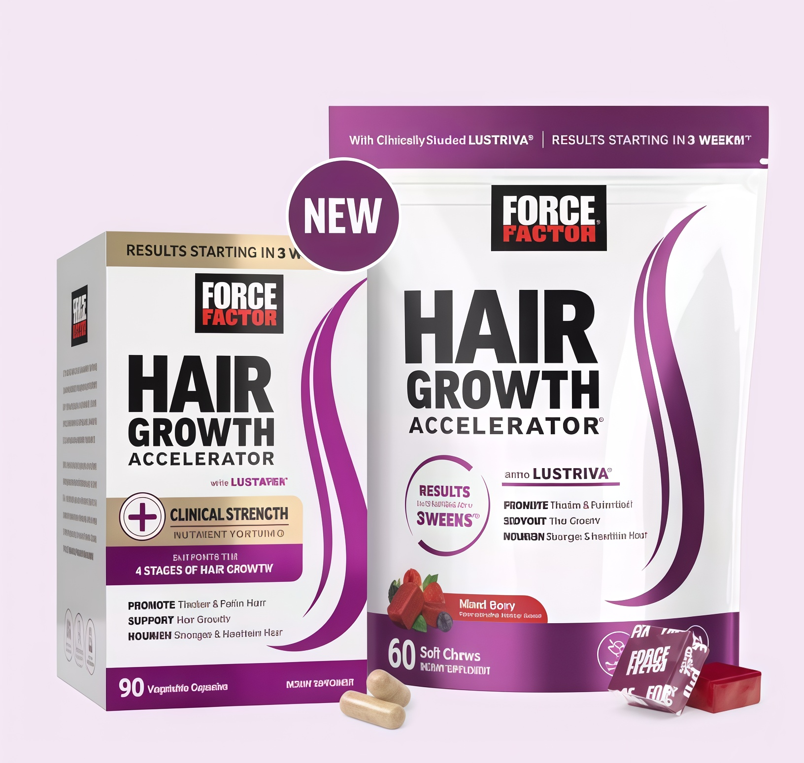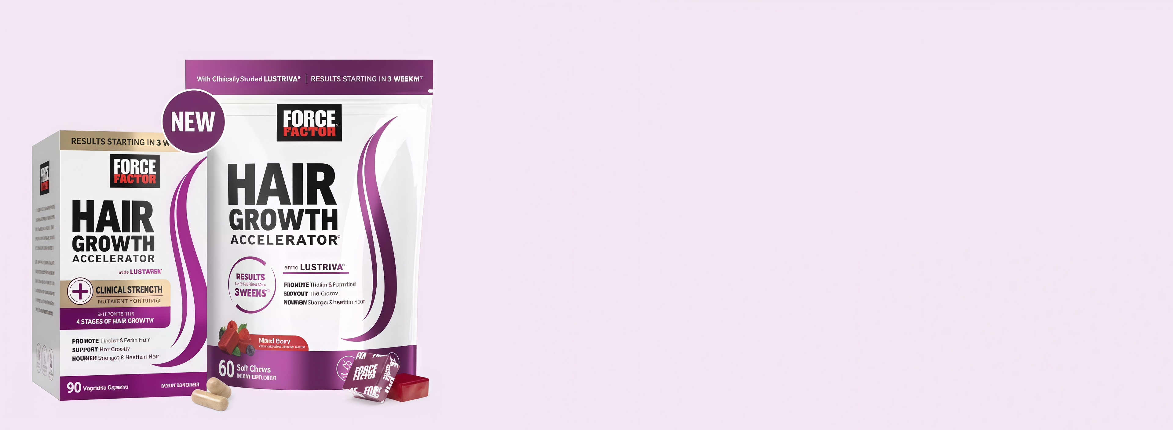 NURTURE YOUR HAIR THROUGH ALL STAGES OF GROWTH Force Factor. Hair Growth Accelerator" is a revolutionary new formula designed to quickly improve thehealth, strength, thickness, and growth of hair. it's powered by Lustriva", a patented and scientifically superiorform of biotin and silicon clinically studied to increase hair thickness in as little as 3 weeks.*